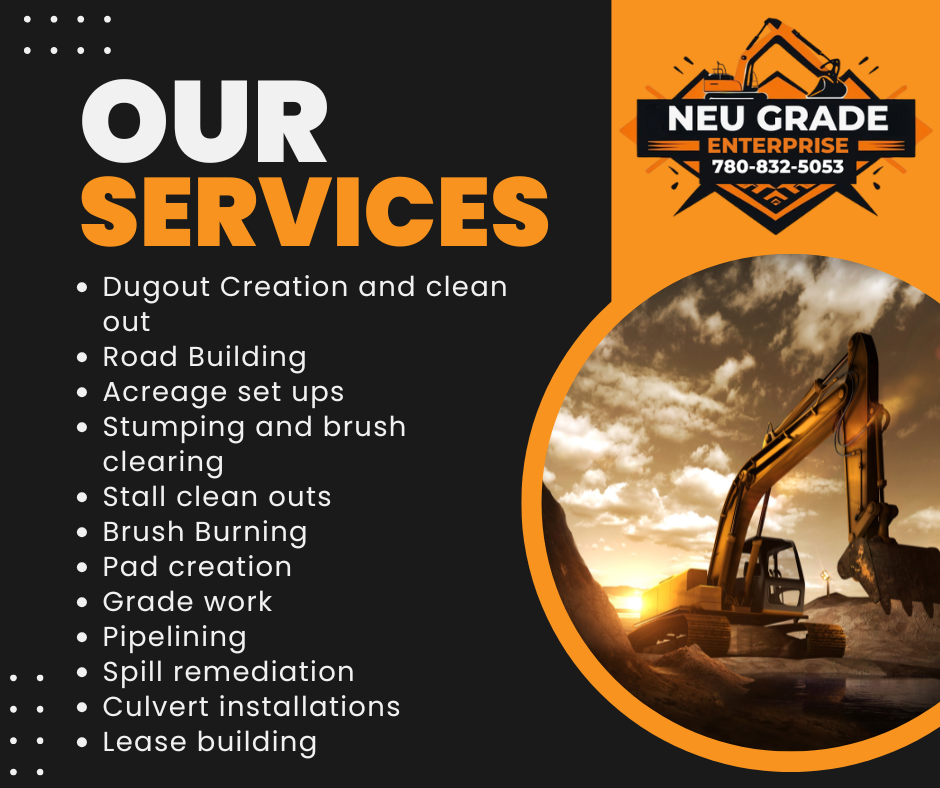Our offerings include dugout creation and clean-out, comprehensive brush clearing and controlled burning, precise excavator services, and versatile skid steer operations. We excel in road building, acreage set-ups, basement digs, and culvert installations, ensuring every project is built effectively and efficiently. From lease building and cleanup to pipeline creation and spill site remediation, our client centered approach guarantees efficiency, safety, and top-tier results every time.